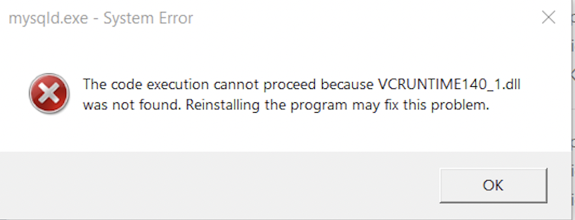 - During installation I got the error for missing “VCRUNTIME140_1.dll” file. Attached screenshot