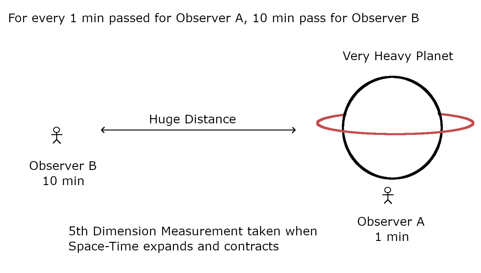 The reason for me to show this table, is to bring the concept of resonance going out of sync for both observers. When we started both the observers were of the same age, but due to the 5th dimension, time passed differently for both. And in the end, Observer-A is only 12 years old but Observer-B’s kid is 20 years. Now lets assume that we go back in time(which is not possible) and Observer-B also comes close to the same/different “Very Heavy Planet”, such the the time is passing at same speed for both. In that case they both are in sync and in resonance. Now this table will be same for both the observers. To summarize this, in order to make the observers resonate, we made the gravtiy same at both locations.