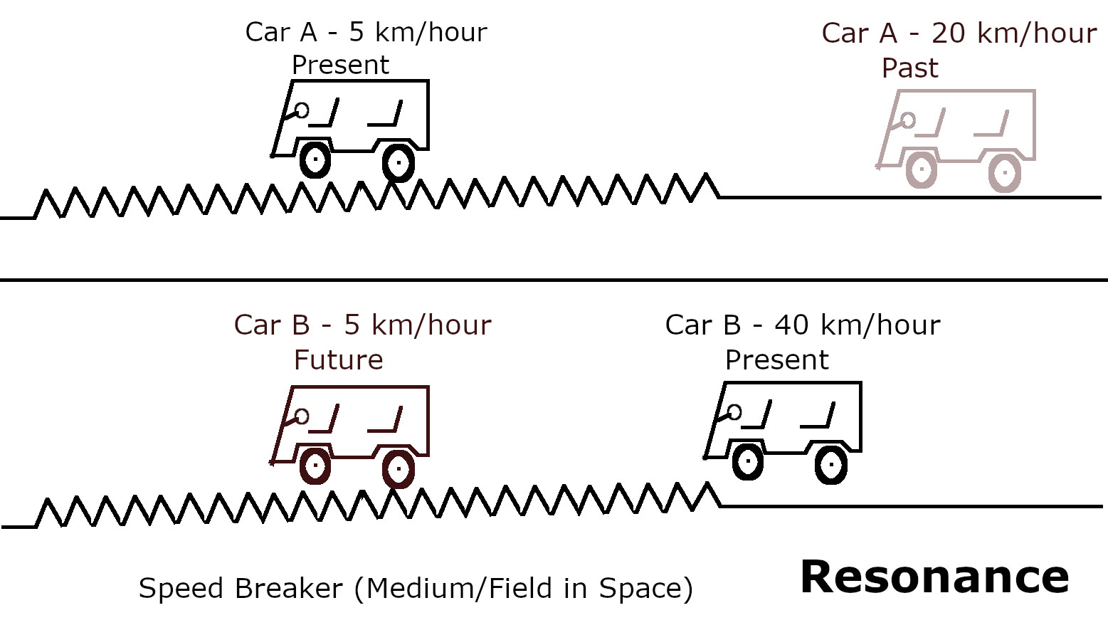 Lets assume that Car A was moving earlier at a speed of 20km/hour and when a speed breaker arrives, its speed becomes 5 km/hour. And Car B, which is moving at 40 km/hour after few initial bumps will be forced to reduce its speed to 5 km/hour. Black color car is in the present state, and light brown color is in the past, and dark brown color is the future state of the car. This is a true example of resonance. Becuase speed breaker(medium) affected the vibration of Car A and Car B. They both were travelling in a different mediums before the spead breaker at different speeds, but when their medium becomes same, thier speed also starts matching after some time. To further understand resonance at atomic level, we will start from the outside Universe and learn about the 5th Dimension.