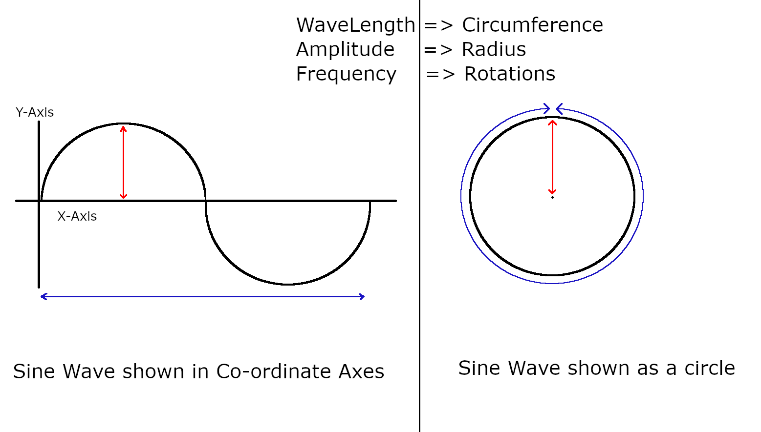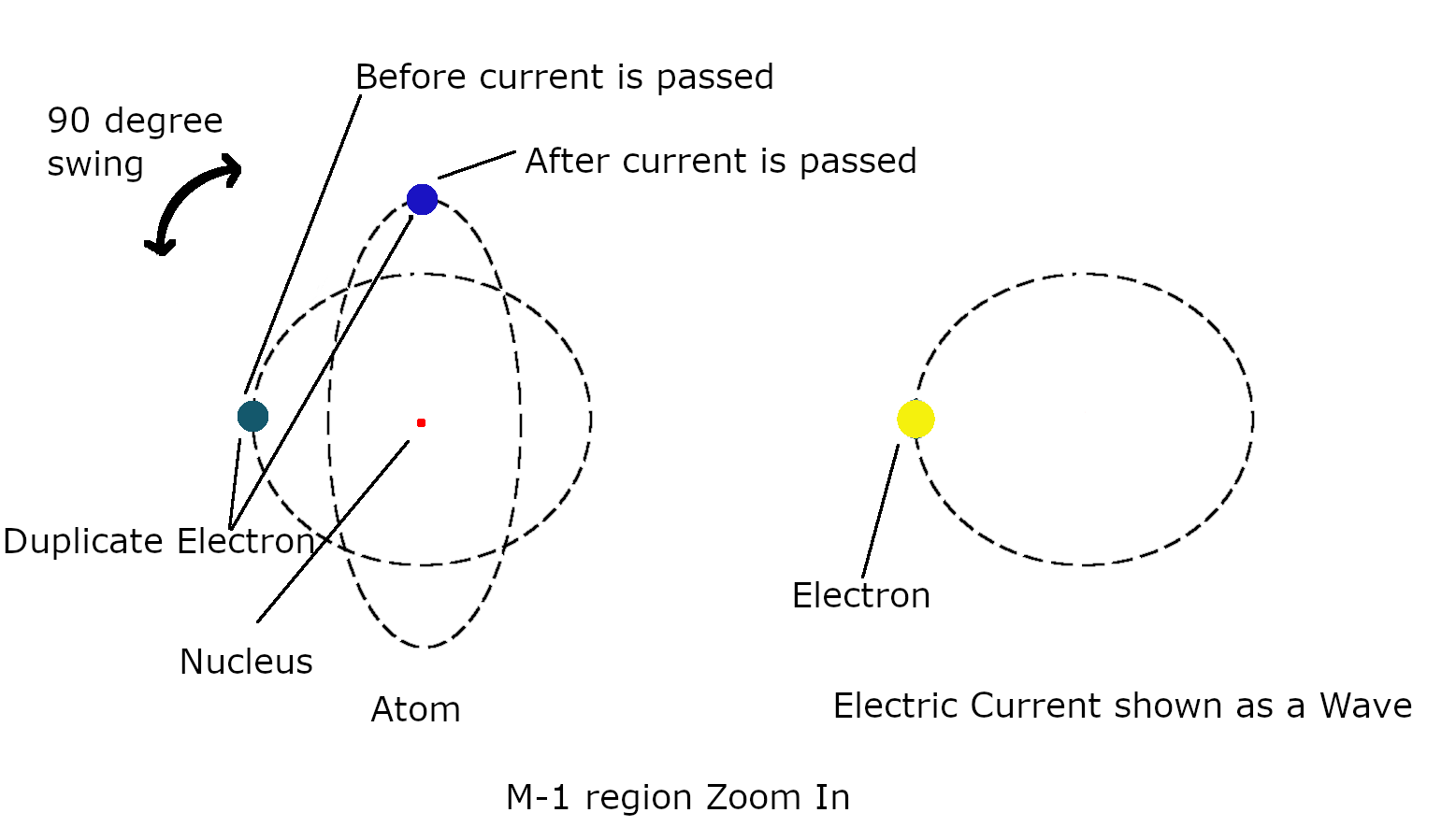 Please note that the motion of electrons around atoms nucleus or in current is not circular. It will be a random and can be described as wave function. And the Nucleus shown as a red dot, becuase its wave function is even smaller than electron and not important to be shown(like for electron in the picture below) here as a circle. Also I wanted to show the electron and nucleus closer to each other, so you may see it at the center of the circle. To explain electron motion, lets consider a very simple example where an electrons motion is a sine wave. Refer the picture below: