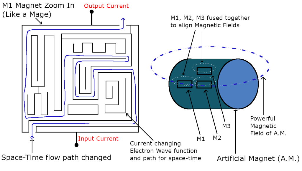Refer to the picture of this mage puzzle on the left side, which is a “zoom in” of smaller magnet M1. This mage is a representation of electrons and fields movement at atomic level. You can also think of this mage as your room, with 2 open doors(Entry from blue arrow line at bottom and Exit from blue arrow line at Top). Now if you keep the 2 doors of this room always open, you will feel air passing through it and a cool breeze always.