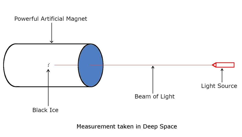 Light of any color, say reddish-orange, is passed through “Artificial Magnets” as shown in the picture. The beauty of these magnets is that they expand space-time and generate an extremely low temperature. And as discussed above, this light beam at extremely low temperature gets converted to black ice. Now from “Conservation of Energy”, we know that energy can neither be created nor destroyed but converted from one form to another.