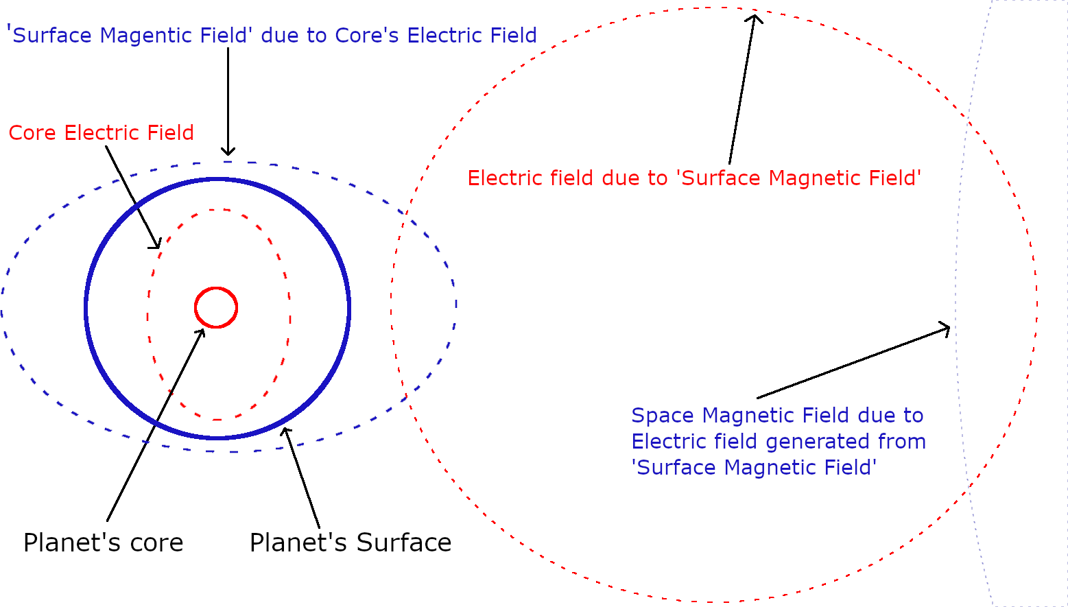 Referring to the fan example, this planet’s magnetic field would also be producing electric fields on the objects nearby. And this vicious circle of electro-magentic fields giving birth to each other and either compressing or expanding space-time is actually called “Gravitational Wave”. You can also say that the quantum gravity at atomic level is kind of the end of this “vicious circle” which starts from the heaviest Star’s core of our Observable Universe.