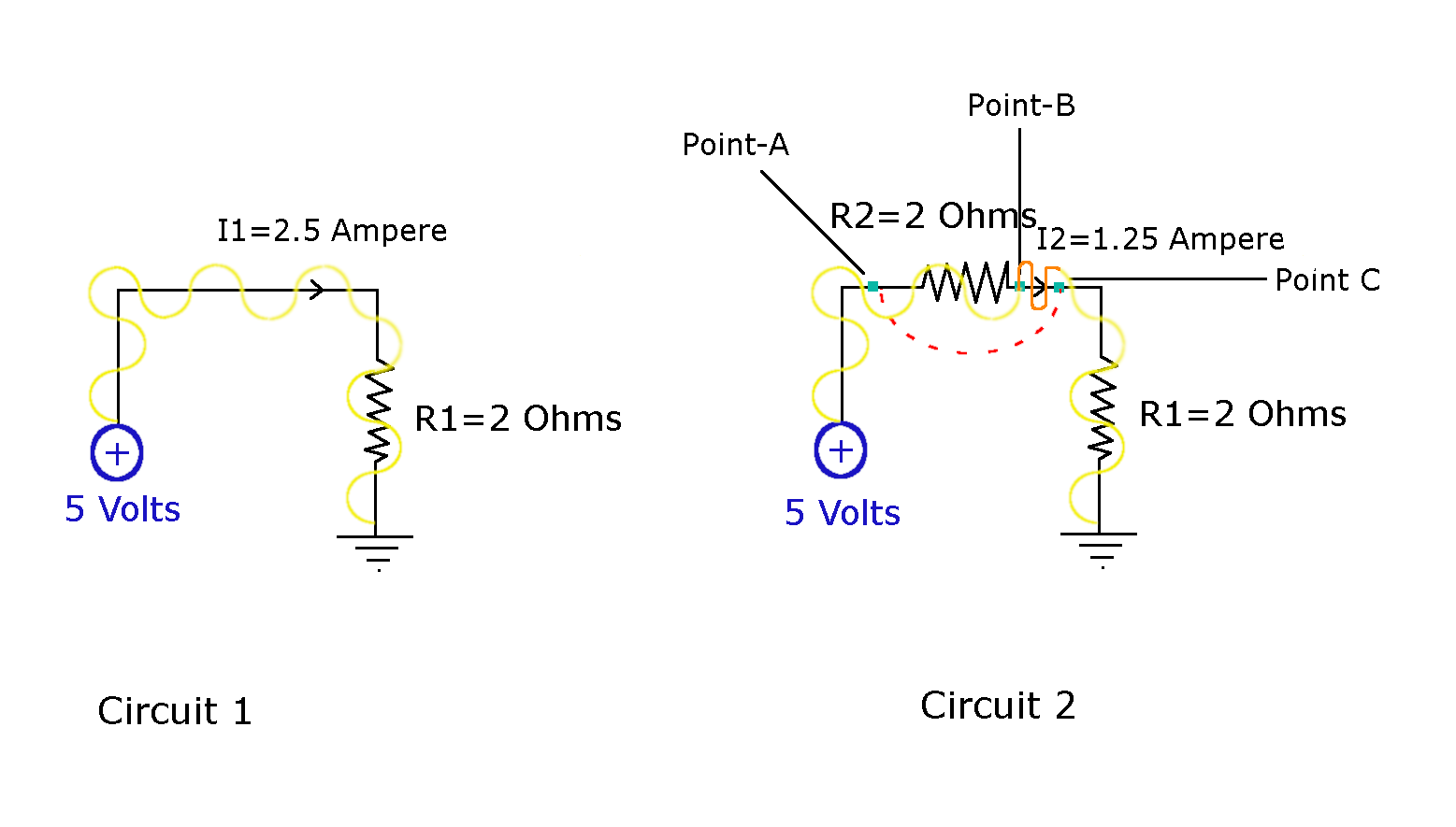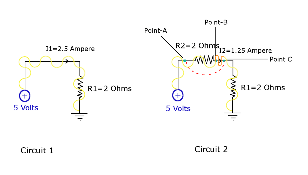 From formula V=IR, we derive I = V/R. So in Circuit 2, if we make the resistance R2=0 between points A and B, suddenly by connecting another wire shown as a red dotted-line, then Current I2 becomes V/0=Infinite, which is called a short circuit as it increases the temperature so high that it catches fire and burns to ash.