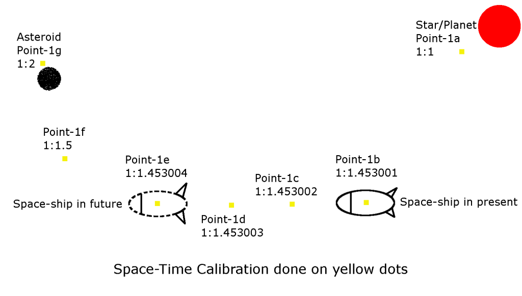 Lets say that the ratio of time passage on the big red circle which can be planet or star is 1:1. This ratio means that as an absolute reference on Point-1a for every 1 second passed, 1 second only is passed on Point-1a as the location is same. However on a distant Asteroid, time passes such that for every 1 second on the star/planet, 2 seconds pass on the Point-1g, so the calibration/ratio here is 1:2.