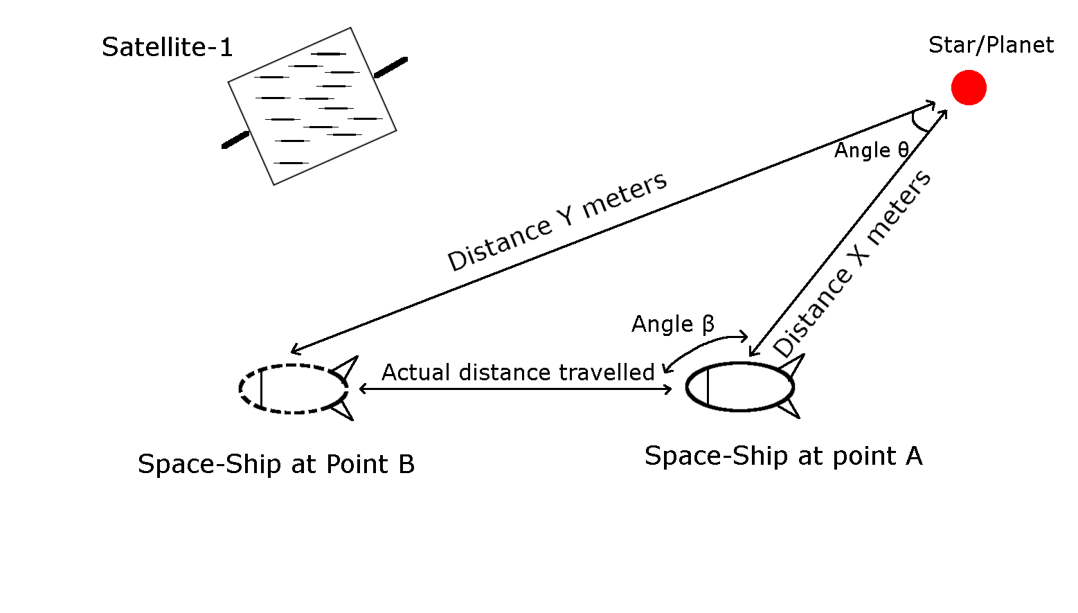 Uses primarily speed of light/electromagnetic radiation to calculate distance and angle between origin and final destination of the vehicle using a satlellite as shown in picture. Here the “Actual Distance travelled” by the space ship from point A to point B will be a trigonometric function {Ysine(θ+β-90)-Xsine(β-90)} derived from X,Y and θ and β.