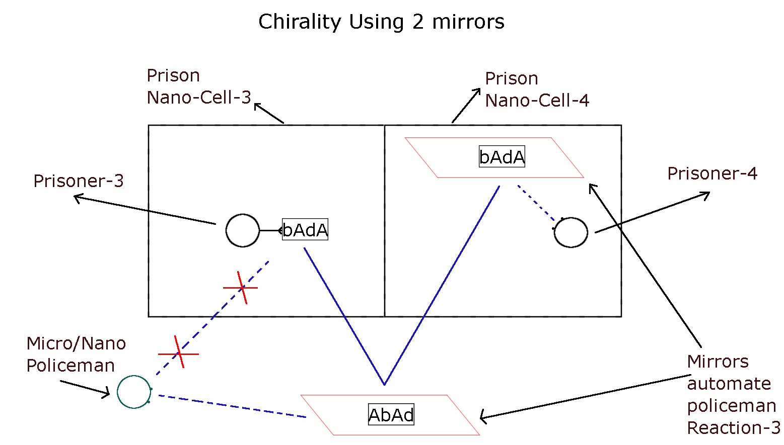 In this picture, we are looking at the nano-cell prison from the top. And the Prisoner-3 here is carrying information (bAdA) for simplicity or it can be anything else also. In this case, the dotted blue line indicates “Line of Sight” for both the prisoner and the policeman. The policeman cannot directly see the information (bAdA) inside nano-cell-3. And unlike in the previous image where we allowed the policeman to go near cell-3 and see the Art-3 and then relay this infomation to the prisoner of cell-4. Here part of his work is automated by a mirror. There are 2 red mirrors placed such that the mirror image of (bAdA) is seen by the policeman as (AbAd), and this image is seen by Prisoner-4 as (bAdA)