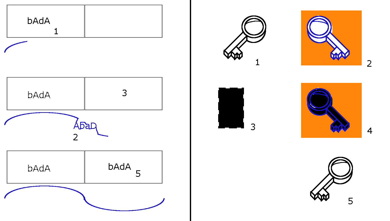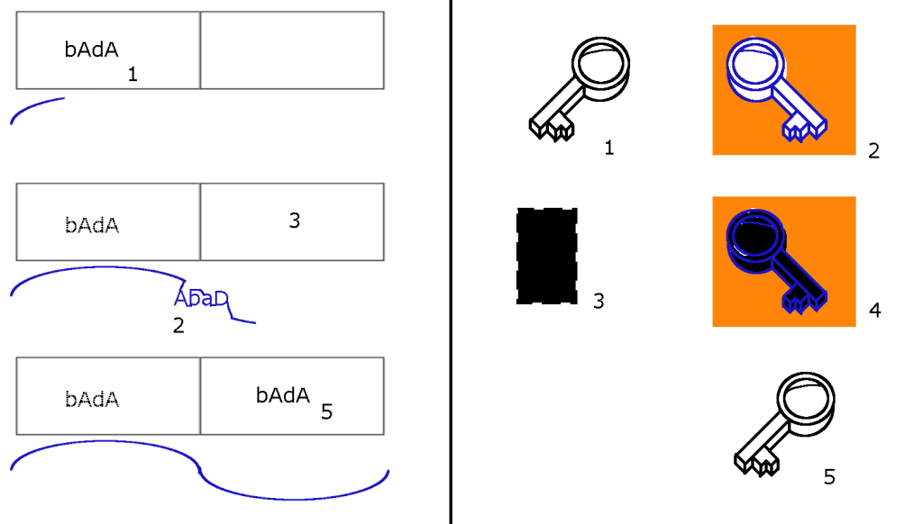 Image on Left: Here we are showing 2 rectangular cells next to each other. And the first cell is holding the information “bAdA” denoted by 1. The blue color sine wave external electric field is progressing in time, and as it passes close to 1, its mirror image is imprinted on the electric field wave function. I have tried to show the modified wave function with the blue color “AbAd” inside the blue wave only for easier explanation. Now when this modified wave function passes close the the cell 3. The mirror image of “AbAd” is imprinted as “bAdA” in 5. Also the original “bAdA” in 1 starts to fade away slowly with time, shown with dotted line in last step.