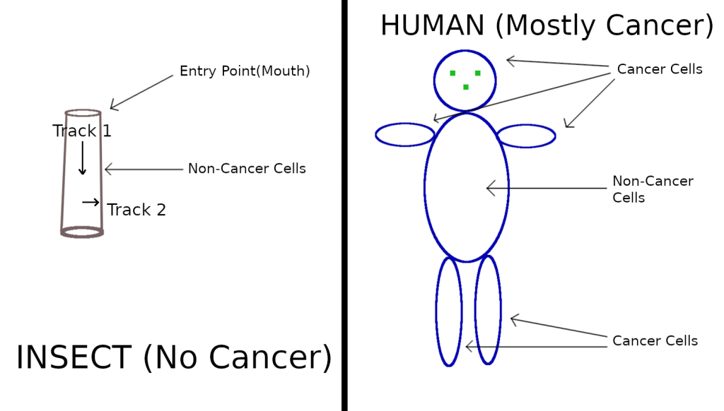 | Insects can easily live by eating sand and water | Humans or bigger animals cannot survive eating sand and water. Their food is protein secretions from the Non-cancer cells |
