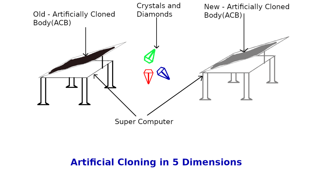 So now, as we know that Non-living things like electronic hardwares have a higher life compared to living cells, because hardware can withstand higher temperatures, collisions etc. Hence these hardwares components one by one are used to clone the new human body parts also one by one and then all 180 parts are joined together to form the full body with all the data as the previous human body.