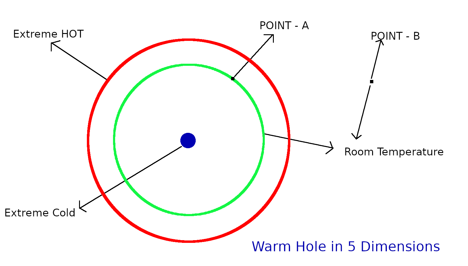 A “Warm hole” is like a ring, whose circumference is at a very high temperature of 100,000 degree centigrade or more, indicated by the red circle in the image above. Due to the space-time continuum, if we create such a high temperature, the electric field will distort the space-time around it and create a very cold temperature of negative value and immeasurable at the center of such a hole, indicated by the blue circle in the image above. So the center of the warm hole is very cold, and the area in between the center and circumference is where we can get a temperature or around 25 degree centigrade which is ideal for cell cloning, indicated by the green circle in the image above.